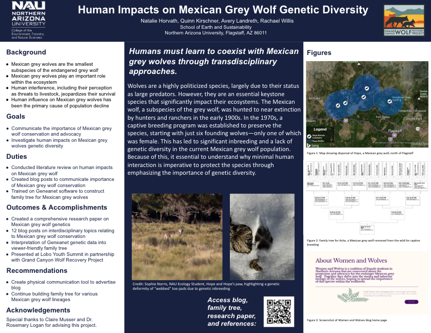 Our capstone project explored how human activity shapes the future of the endangered Mexican gray wolf (Canis lupus baileyi). These wolves are vital to the health of ecosystems in the Southwest, yet their recovery is deeply influenced by human decisions about land, livestock, and policy.